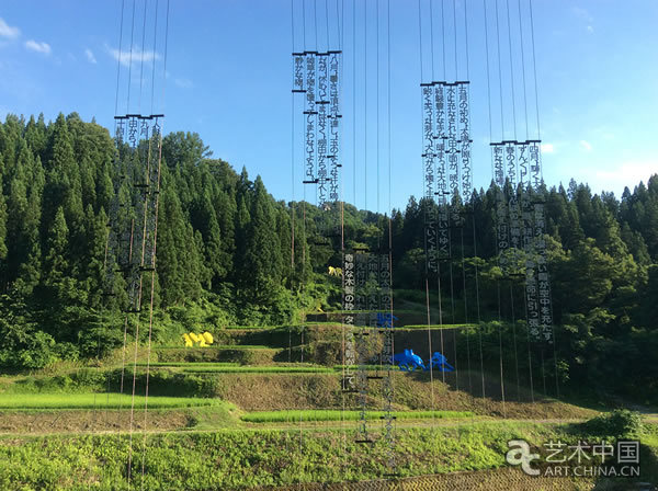 比如作為大地藝術祭標志性作品,俄羅斯當代藝術家卡巴科夫的《梯田》,當卡巴科夫來到初春殘雪的越后妻有地區,看到農人在梯田上不斷勞作的情景,他深受感動,在將要廢棄的梯田上創作了一組“犁田、播種、插秧、割草、割稻、到城里販賣”反映農民生態的彩色群雕,在雕塑前豎起細細的鋼架,上面懸掛著吟誦鄉村詩篇的立體文字,整組作品充盈了農耕文化的詩意。