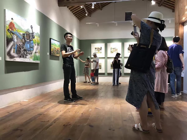 畫家牧兒在導覽“向日葵下的拖拉機” 策展:崔燦燦 攝影:張鑫