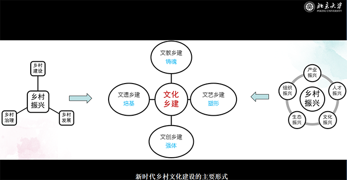 那么,作為第三方力量的鄉建力量,高等院校、社會組織該怎么把自上而下的政府主體、商業主體和自下而上的基層力量做一個很好的連接?這是我們作為系統性、總體型文化鄉建所要關注的問題。在這里,總體型的文化鄉建包括文化遺產鄉建,起到培基的作用,在保護鄉村文化遺產的基礎上進行鄉創文化生活的重建;包括文化教育鄉建,起到鑄魂的作用;包括文化藝術鄉建,起到塑形的作用;包括文化創意鄉建,起到強體的作用,推動鄉村一二三產業的融合發展。