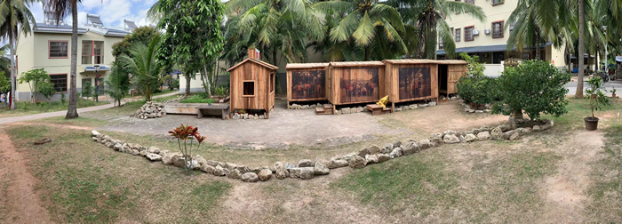 2022年,翁奮將他的思考與研究付諸于實踐,開始實施他的“藝術屋-群島計劃”,該計劃落地的第一個空間是“秦山村植物茶園”。 藝術家在文昌泰山村的安置區的公共空地上仿制當地村民田間的“安全屋”搭建了七八座吊腳木屋,屋外木墻上印制著翁奮拍攝的村民影像。木屋之間相互聯通,地板鋪有涼席,人可在其中穿行坐臥,墻內壁格、木桌和地面上置入海石,木屋外圍栽種著各色植物。翁奮的“秦山村植物茶園”可以看做在現代鄉村規劃理念下的“新聚落”里內置的一個微小的海島原鄉烏托邦。
