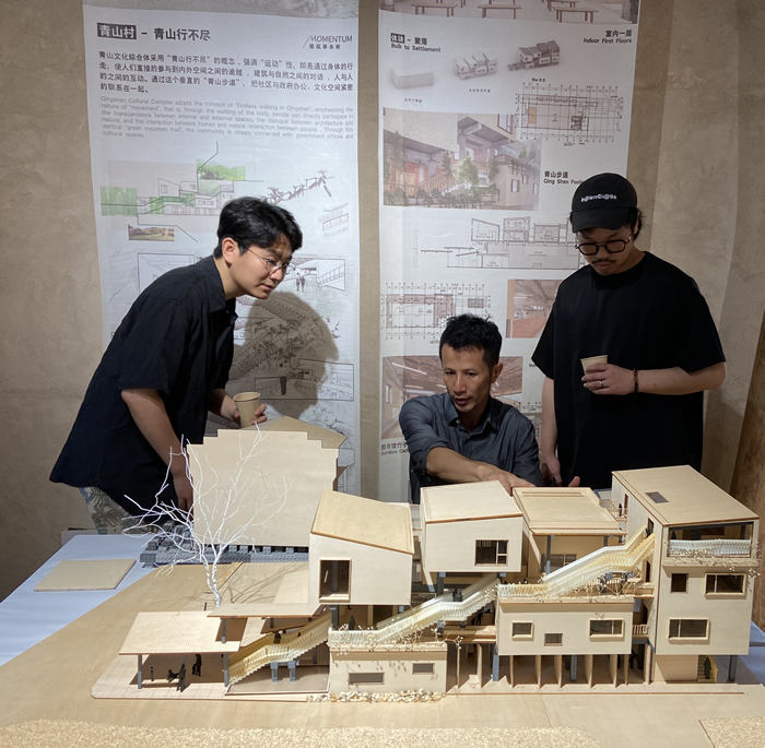 第二天,張雷相約筆者在一所夯土老屋里見面,這里正在舉辦 “青山建造進行中”在地建筑展覽開幕式。張雷個子很高,穿著黑衣,梳著馬尾辮,動作迅捷,頗有藝術家氣質,這個小型開幕式可以說是一個鄉建文藝家聚會,張雷熱情地向筆者介紹了青山村的新老居民:建筑師黃明健、教育專家蔣莉、夯土建筑家任衛中、非遺油紙傘傳人劉偉學...黃明健也向嘉賓介紹了正在建設的青山學堂和青山村文化綜合體。