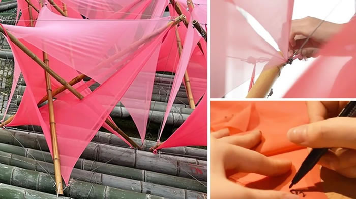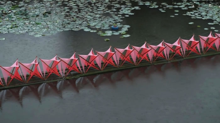 作品名稱取自宋詩“春水渡傍渡,夕陽山外山”。是由原竹、彈力布、竹筏等綜合材料通過張拉單體構成的水上藝術裝置。呈現一種盛開的姿態,一種萬物生長的氣息,一種打動人的生命力?!按核苯栌魈一?,“渡”是竹筏,引導游人視線從此岸到彼岸佇立上千年的陽山和新農村的灰瓦白墻?!按核伞弊屘以创宀粌H僅春天有桃花,四季也都有了桃花。學生們希望通過這座浮橋展現出桃源村的桃花盛景、飄香蜜桃和風土人情,讓“桃花”盛放在桃源村的一年四季里。