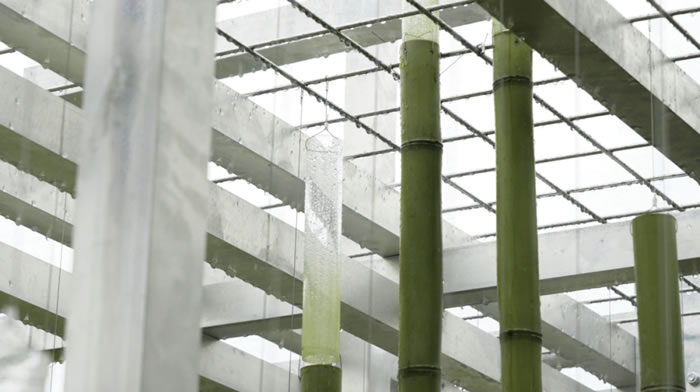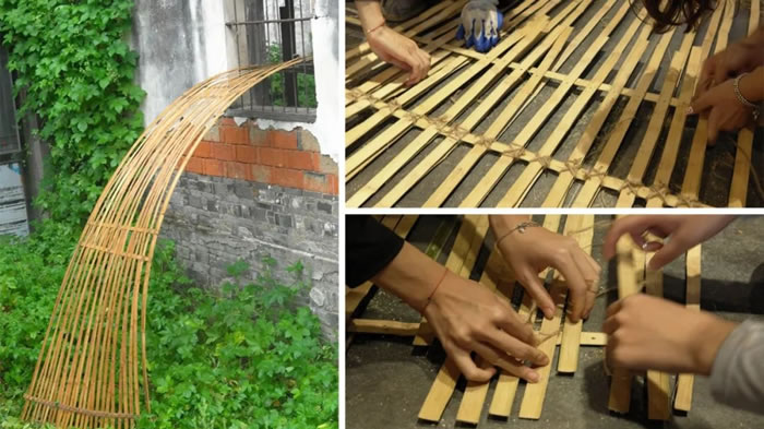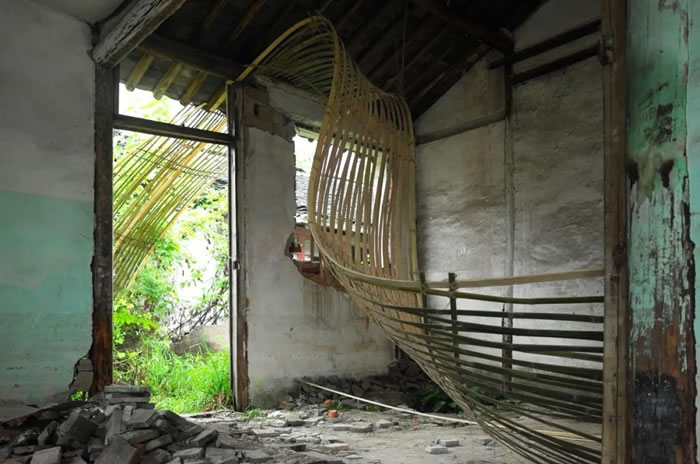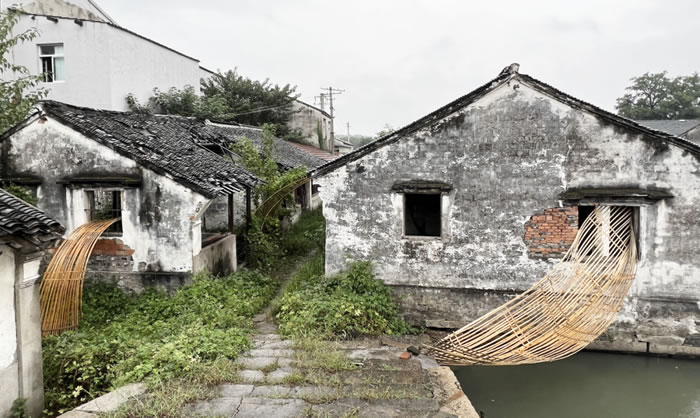 設計靈感源自水面漣漪,巧妙地將房屋、橋梁和碼頭連接在一起。用竹與線兩種材料進行彎曲與編織,以仿效自然的方式,既回應了當地的環境,又強調了可持續性和美感。在場地中自由穿梭,突破建筑的框架與水陸的邊界。一剛一柔,若隱若現,形成對比,引人駐足?!八@” 不僅是一件裝置藝術作品,更是對大坊橋這個歷史名村的一次深刻反思,提醒我們,鄉村傳統文化可以與現代藝術相結合,以新的方式煥發古村、古宅的生機。