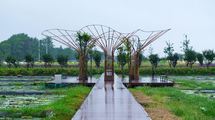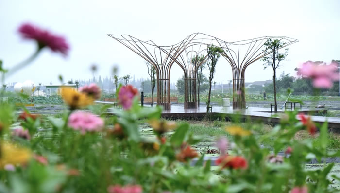 作品“蘭亭”,搭建在三洞橋村蓮花蕩入口不遠處的一片荷花池旁。這里有山有湖泊、有荷花池、有高標準農田,自然景色優美、農業特色資源豐富。