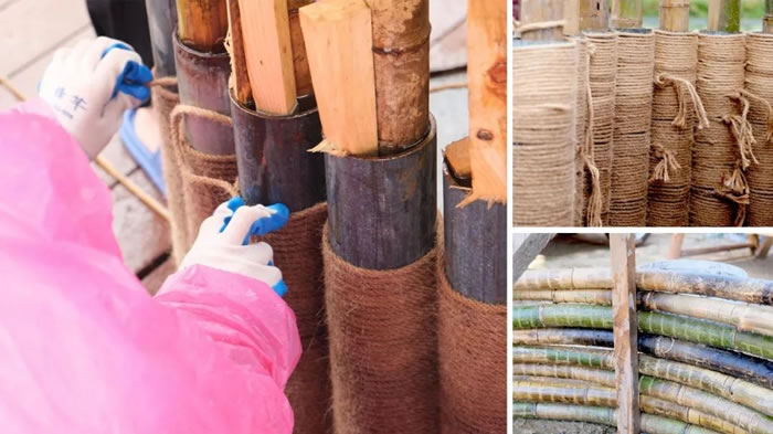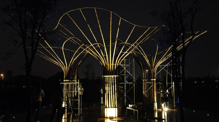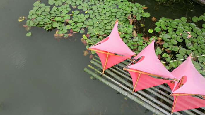 作品從場地內的芡實和荷葉提取設計靈感,并力求與宛山湖大橋產生一定聯系。用竹子為主要材料,塑造出在水面飄蕩的優美造型。荷花的輕盈,流動的光影,和波光粼粼的水面相互交融、相互呼應,營造出作品的動感和視覺吸引力。小分隊學生們希望村民和游客置身其中獲得與周圍環境的共鳴,產生令人愉悅的觀賞體驗。