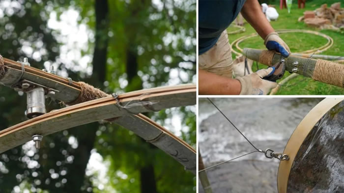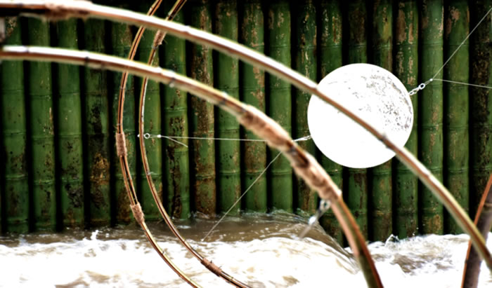 裝置靈感源于壩上流動的“水”本身,旨在運用以竹為主的多種鄉村在地材料,從視聽觸三種感官出發感知水,尋找不同材料連接人們與水多種互動關系的可能性。裝置整體呈現為多個圓形竹圈環環相扣,由對應感官的三部分構成。視覺部分鏡面的鼓面與水的光影相互映射,波光粼粼;聽覺部分以海浪鼓為原型,收集當地碎石、沙粒等多種天然材料,回響涓涓細流;觸覺部分以推動旋轉的竹圈共同轉動,達到動靜結合,激起水花蕩蕩。當人們觸碰、推動“旋鼓”,多個竹圈開始旋轉帶動著內部的鼓,不斷發出多種“水”的聲音、光與水變幻無窮,輕盈又富有動感,人與水的關系被放大,“旋鼓”與龍鱗壩一起成為當地鄉村生活的一處美好風景。