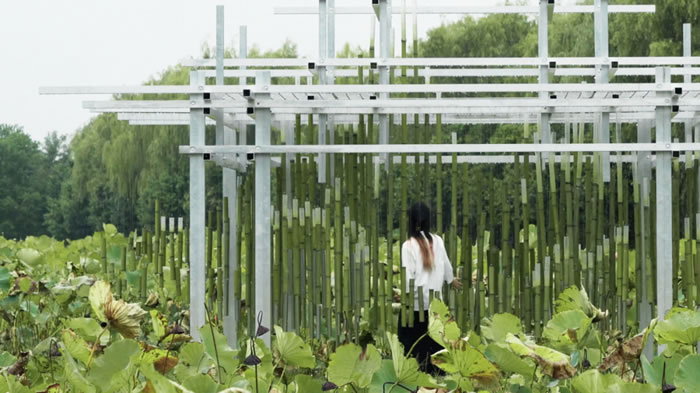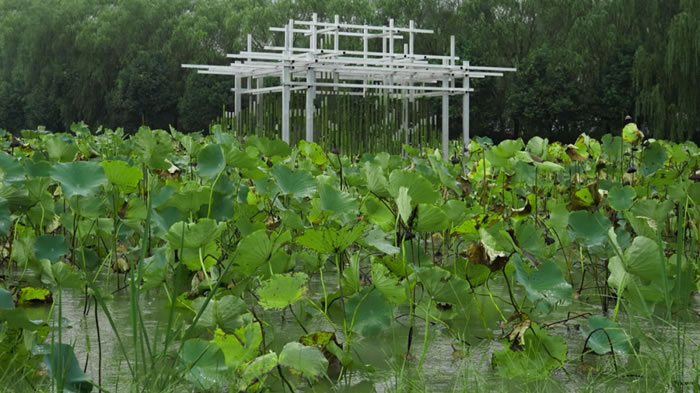 作品取晉代《蘭亭集序》中“絲竹管弦”等意象,營造雅集之意境,融入當地古往今來的美景。主體材料采用當地竹材,上下錯落連接亞克力管和不銹鋼管,以起到在風吹撥動中產生材料節奏的碰撞。通過序列擺放及懸掛,順應蓮花蕩山水之勢,以有機流動的線條凝練湖泊、綠島、遠山等地域自然形態,融入自然。結構的設計提取了古代方亭的外觀,運用鋁合金方管作為材料語言,整個作品無論是造型還是材料都融合了當地一山一水一磚一瓦的氣息。