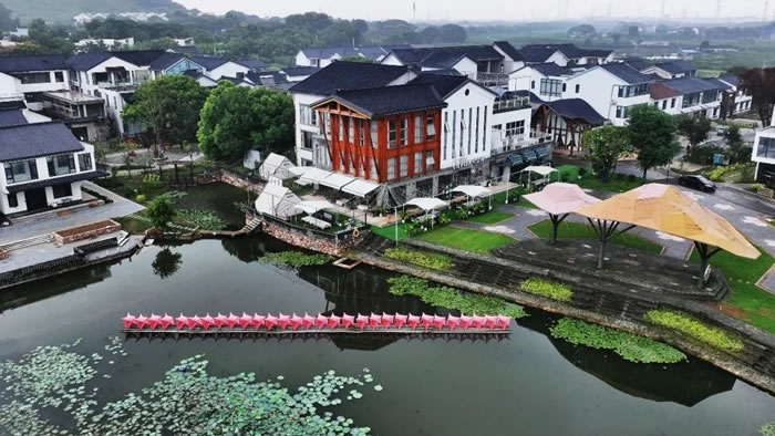 作品“荷悠蕩”,搭建在謝埭蕩村芡實采摘園四周環繞水域的平臺之上。謝埭蕩村“因水而興”,碧波、泛舟、詩意、古香;香榭、品茗、白鷺、湖光……垂竿閑落漣漪起,笑歌相攜田間去,展現出一幅“休閑天堂、垂釣樂園、體驗勝地、美麗鄉村”的畫卷。