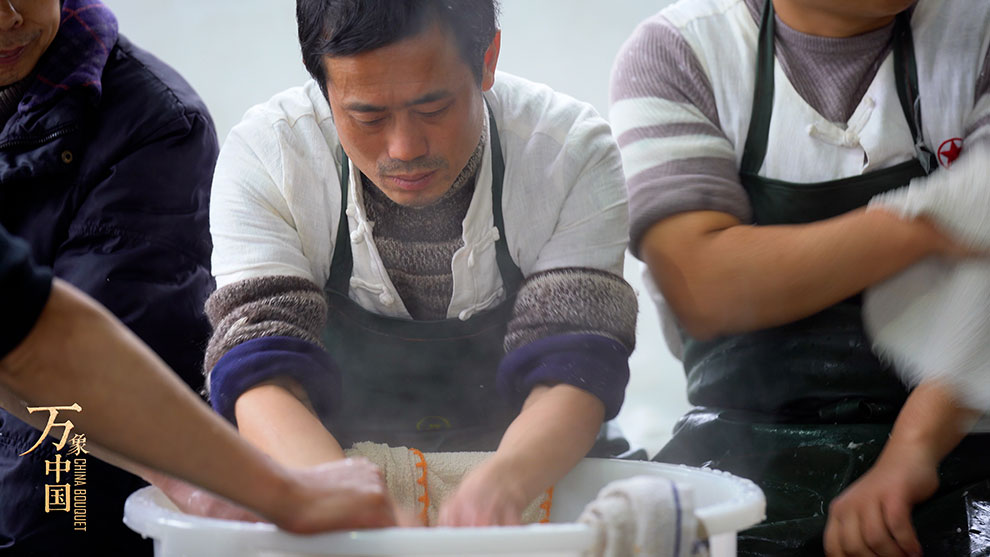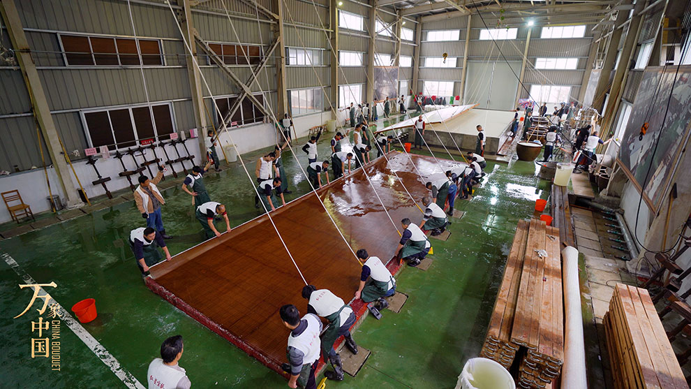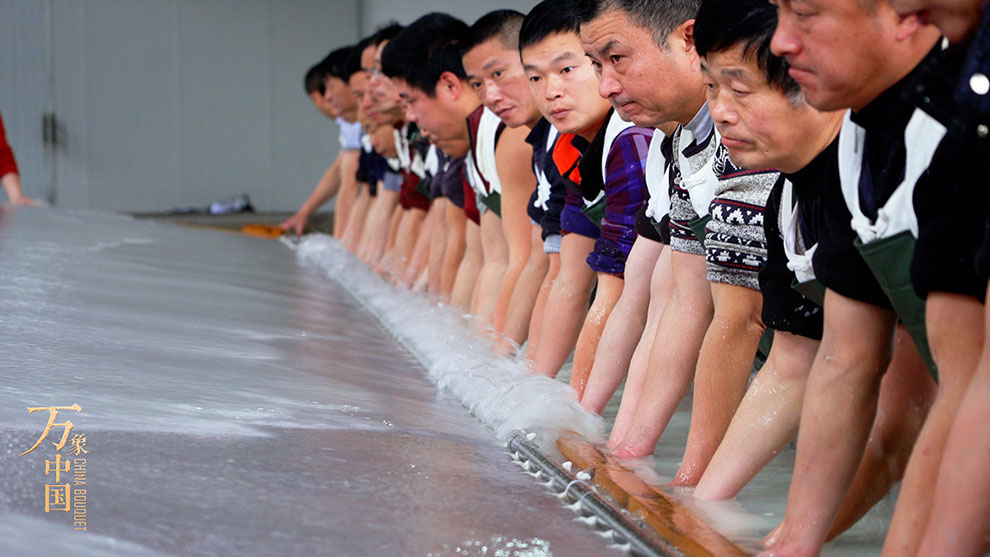 宣紙,顧名思義誕生于安徽宣城,是利用當地特有原料與傳承工藝制作出來的紙,是中國書畫藝術的重要承載。周東紅是中國最大的宣紙廠——紅星宣紙廠的撈紙名匠,他仔細鉆研,終于找到了復原古代超大型宣紙的方法。在他的帶領下,近百人齊心協作,成功制作出長11米,寬3.3米的巨型宣紙,整個撈紙過程場面震撼、激動人心。