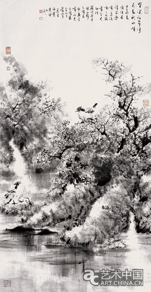 勞偉的云嶺高原山水,由于獨特的地理環境與氣候條件,其雄奇深秀、煙云供養和開合起伏的絢爛多姿、神秘玄妙,給人的視覺沖擊力最大,面貌也十分強烈。這一類作品強化了他得之于云南高原山川寫生的強烈感受,布境多雄渾高曠、虛實相生,筆墨則氣厚思沉、蒼潤相濟?;虍嬿蠛谏綅?,“黑墨團里天地寬”,反映著溪水的清亮和白云的飄??;或畫崇山茂樹,積郁著旺盛的活力,透露出樸茂高華的氣格;或畫深谷人家,寄托有動于衷的情感;或畫云下林泉,注入讓人感奮的精神容量。筆墨則視自然情境的感受不同而各盡其妙,或凝重堅實,如《小河淌水》;或清新潤澤,如《清韻在茲》;或老辣蒼厚,如《龍潭之夏》;或積墨含渾,如《云嶺晨曲》;或筆簡意遠,如《故境難忘》;或干筆焦墨寫《澗邊小村》,或濕筆潑墨繪《春風春雨寫妙顏》,云南的自然景觀在他的筆下得到淋漓盡致的發揮,雖嘗試了各種面貌,但一律追求境界的雄渾闊大,氣格的高亢老蒼,筆墨也在或蒼或潤或繁或簡的律動中強化了虛實對比與疏密節奏,筆厚意豐,神光煥發,顯示出“不與人同”的藝術個性。即以墨為骨、煙云為輔,皴擦多于勾勒的語言特色。勞偉則把這一特色加以強化,加以豐富,糅合書法的力之美以強其骨,融會丘壑的造型美以發其趣,灌注墨法的韻之美而增其氣,旁參西法的構成美以助其勢,用以運情寫境,著力表現大自然的“質有而趣靈”(南朝王微《敘畫》),尤耽于煙巒云樹在風卷云舒中的運動變化,有效地表現了大自然永恒的活力和對時代脈搏的獨特感受。