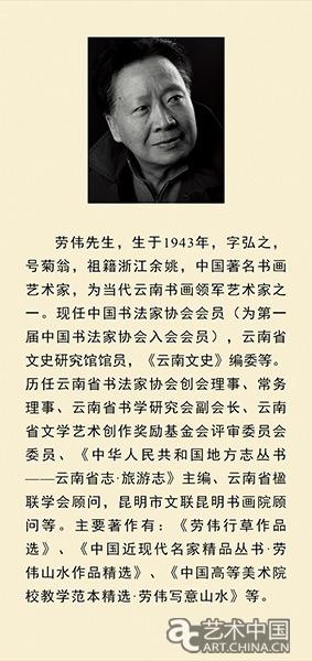勞偉先生,生于1943年,字弘之,號菊翁,祖籍浙江余姚,中國著名書畫藝術家,為當代云南書畫領軍藝術家之一?,F任中國書法家協會會員(為第一屆中國書法家協會入會會員),云南省文史研究館館員,《云南文史》編委等。歷任云南省書法家協會創會理事、常務理事、云南省書學研究會副會長、云南省文學藝術創作獎勵基金會評審委員會委員、《中華人民共和國地方志叢書——云南省志·旅游志》主編、云南省楹聯學會顧問,昆明市文聯昆明書畫院顧問等。主要著作有:《勞偉行草作品選》、《中國近現代名家精品叢書·勞偉山水作品精選》、《中國高等美術院校教學范本精選·勞偉寫意山水》等。