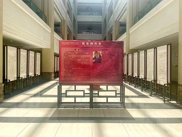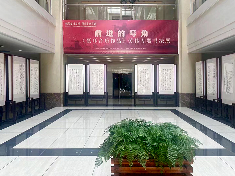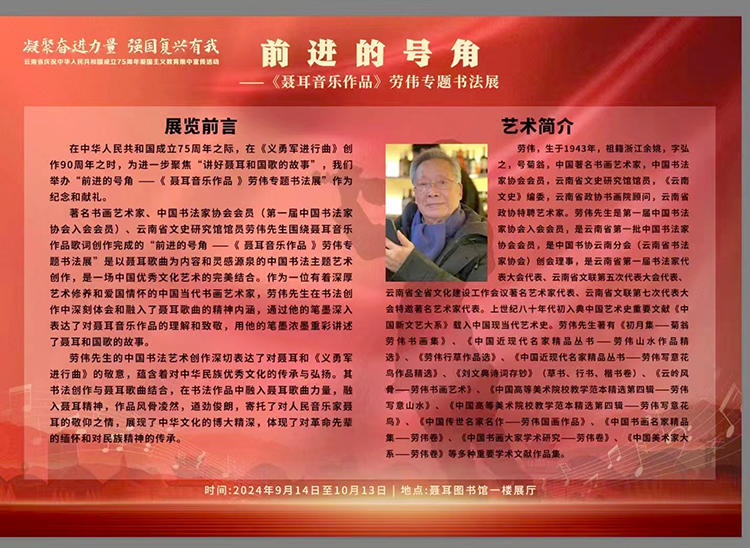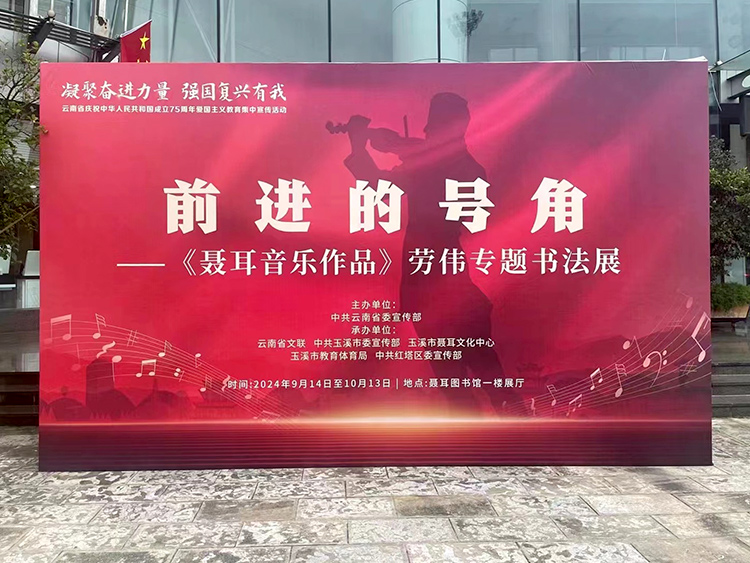 近日,由中共云南省委宣傳部主辦,云南省文聯、中共玉溪市委宣傳部、玉溪市聶耳文化中心、玉溪市教育體育局、中共紅塔區委宣傳部承辦的“ 凝聚奮進力量 強國復興有我 · 云南省慶祝中華人民共和國成立75周年愛國主義教育集中宣傳活動 ” —— “ 前進的號角 ——《 聶耳音樂作品 》勞偉專題書法展 ”在人民音樂家聶耳的故鄉玉溪市聶耳圖書館開幕。在國慶75周年來臨之際,在《義勇軍進行曲》創作90周年即將到來之際,聚焦“講好聶耳和國歌的故事”,專題舉辦“前進的號角 ——《 聶耳音樂作品 》勞偉專題書法展”作為紀念和獻禮。