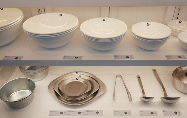 前店的售賣區是工銷社最有特色的空間,也是D&DEPARTMENT產品最集中展示的區域。工銷社保留了上世紀六七十年代老工銷社的柜臺、櫥柜的形式感。青色泛舊的木櫥窗,以及店員與消費者相隔柜臺交流的方式,令都市人產生懷舊感和親切感。雖然形式傳統,但商品的擺放、燈光的設置、店面清潔程度、店員對商品熟悉程度則是按照D&DEPARTMENT的要求嚴格執行。來自日本總店的高橋惠子、福岡店的阿部和東京店的齊藤等日本員工與中國員工一起工作,不僅參與開業籌備,也親自示范店面的工作要領,其專業化程度和職業精神令人欽佩。