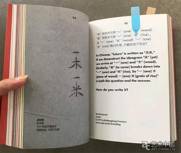 青年藝術家胡曉媛的作品《一木一米》作品看似簡單卻意蘊深遠。她在一本書的襯頁上,寫下“一木一米”。她將未來的“未”字拆解成一個木字,“來”字拆出一個“米”字。最后她寫到“既問亦答,只看你怎個寫法?”