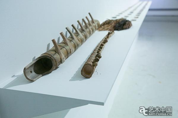開幕式結束后,現場幾位藝術家開始將幾十根竹節逐一布置于地面。這些竹子有一排孔,孔中已經生出小苗。這是藝術家湯南南的作品《海芽》。這件作品由幾十根竹笛組成,竹子是作者家鄉漳州漁村培植海蠣的竹子,竹管中又填滿了杭州的泥土,土中培植了油菜籽和黃豆芽,它們將在展期持續生長。作品以鄉愁為切入點,探討了時間與記憶、鄉愁與生死等命題。