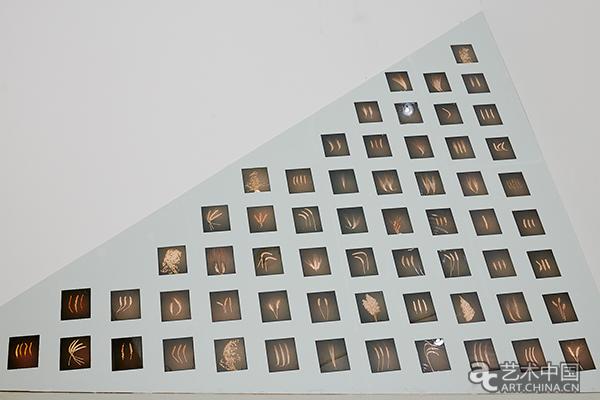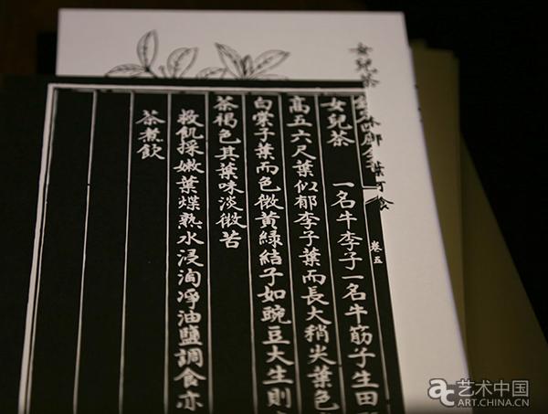 在二層展廳,有一個黑柜立于墻根處,黑柜的每個抽屜放置著植物插圖。這是厲致謙根據明代朱橚的《救荒本草》制作的裝置作品。朱橚是朱元璋第五子,出身帝王世家,卻無意政治,終日癡迷于研究中草藥。這本書教黎民百姓如何利用自然界的植物代替食品,以度荒年。該書首開野菜著述一門,對植物學、農學、醫藥學影響深遠?!毒然谋静荨返耐怀鎏攸c是圖文并茂,每種植物都配以精確美觀的版畫插圖,方便了不識字的百姓觀看,將實用性與藝術性融為一體。