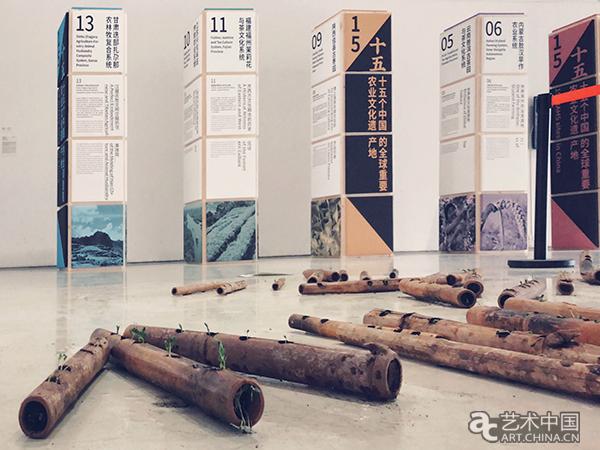 在展廳一層大廳里立著幾根方柱,上面記述了浙江青田魚共生系統、江西萬年稻作文化系統、云南哈尼稻作梯田系統、陜西佳縣古棗園等15個在中國的全球重要農業文化遺產的介紹資料。