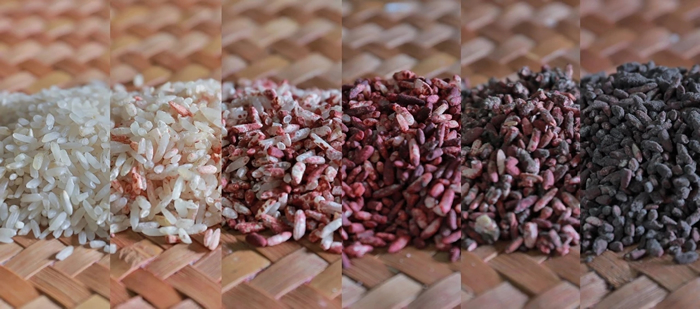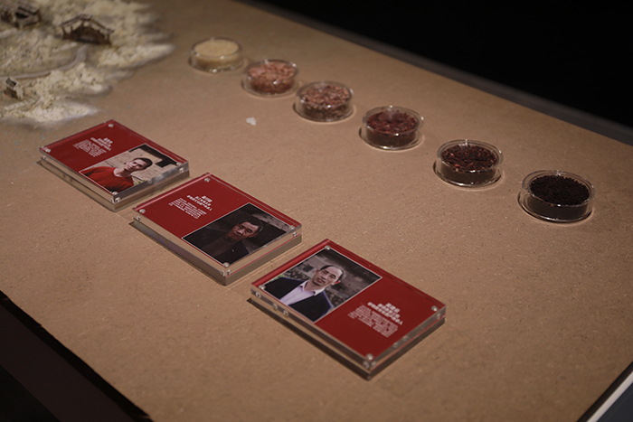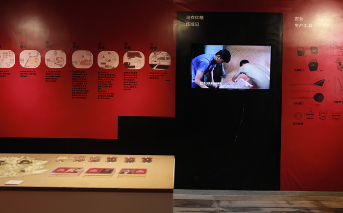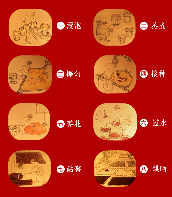 展覽中烏衣紅粬制作的浸泡、蒸煮、攤勻、接種、養花、過水、站窖、烘曬八道工序以精美的插畫方式清晰地呈現出來。其中每一道工序都需要精心制作,米和菌種的選擇以及動作火候都需要精心把控。在站窯這個階段,粬母們忙著長出菌絲,米飯的顏色在之后六七天的時間里,如天邊的光影,由白色變為紅色再變為灰白,再次過渡到紅色,最后轉為黑色,這一過程稱為“紅地起烏衣”。