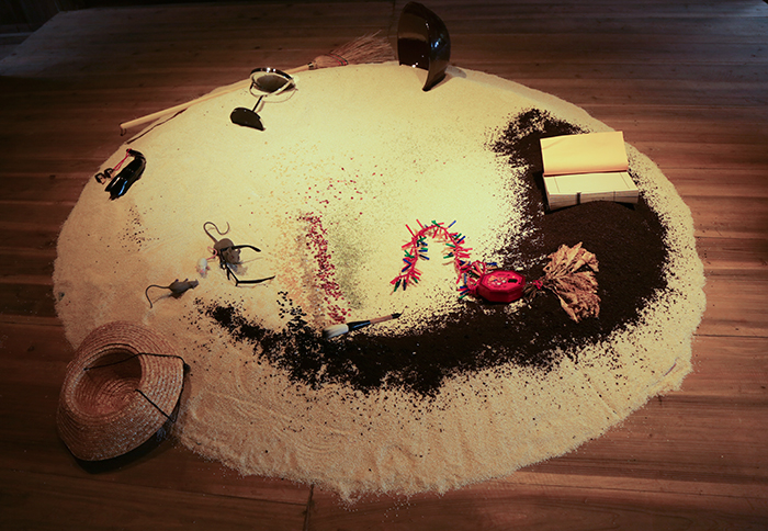 厲致謙、朱琺合作的米字作品第三回也在二層展廳呈現,作品選字順序扣合制粬過程,作品在戶外亦有展示。在展廳一個角落,散落著一堆白米和粬米,上面擺放著書、草帽、毛筆、眼鏡、玩具小鼠等物品,這是王威的2019年方志小說駐村計劃的裝置作品《徐公考鏡》,作品取材于泰順地區民俗活動、民間傳說,通過實物結合環境的方式,視覺還原為各個章節,作品為開放式格局,邀請參觀者留下物品。