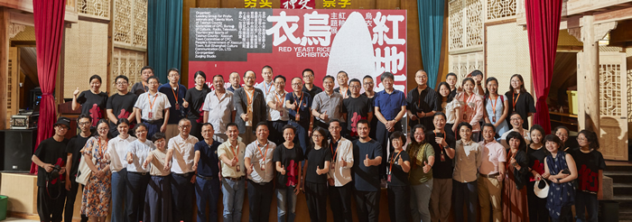 一層展廳核心內容是烏衣紅粬文化和老建筑改造。烏衣紅粬文化是本次展覽的核心主題。烏衣紅粬制作以大米為原料,經接種粬母培養而成。用紅粬釀成的酒稱為紅粬酒,它具有色澤鮮艷,酒味醇厚的特點。其中烏衣紅粬是紅粬霉、黑粬霉和酵母共生制成的粬子。當地的栗栗燒肉、燉雞,喜愛添加紅粬酒,而蛋絲酒、紅粬酒蒸肉是這里的紅粬特色美食。本次展覽活動中,嘉賓都領到了紅粬啤酒,酒瓶之后將被用于再創作。