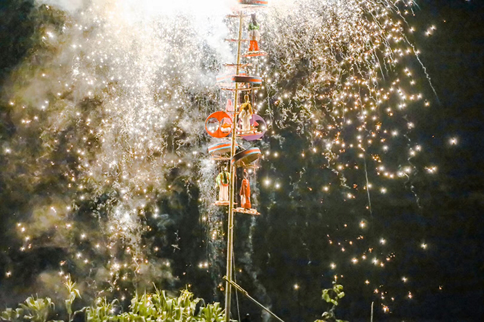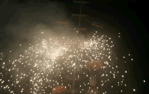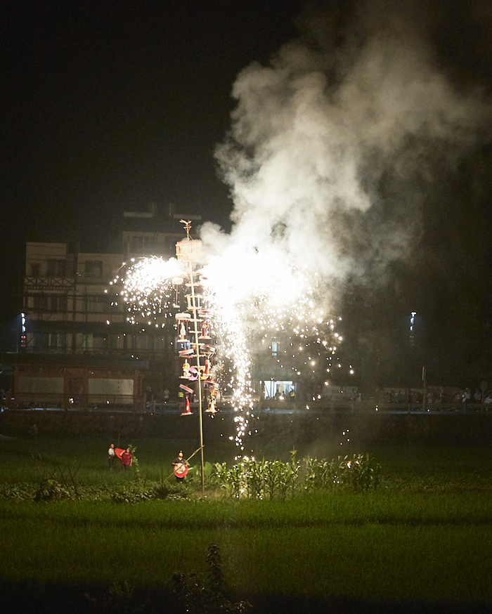 晚上七點左右,首先在徐岙底村外玉溪河灘上舉行了藥發木偶表演。藥發木偶源于宋代,是一項以火藥帶動木偶表演的傳統手工技藝。相傳宋人王立宦所創。目前僅存在于浙江泰順民間。在一根長度為13至15米的毛竹竿上,隔層裝置特制煙花輪和身穿光臘紙服裝的彩色木偶,當最低層的煙花輪引線點燃后,會逐層噴放艷麗火花,帶動木偶表演。焰光下紙人凌空飛舞,甚是美觀。