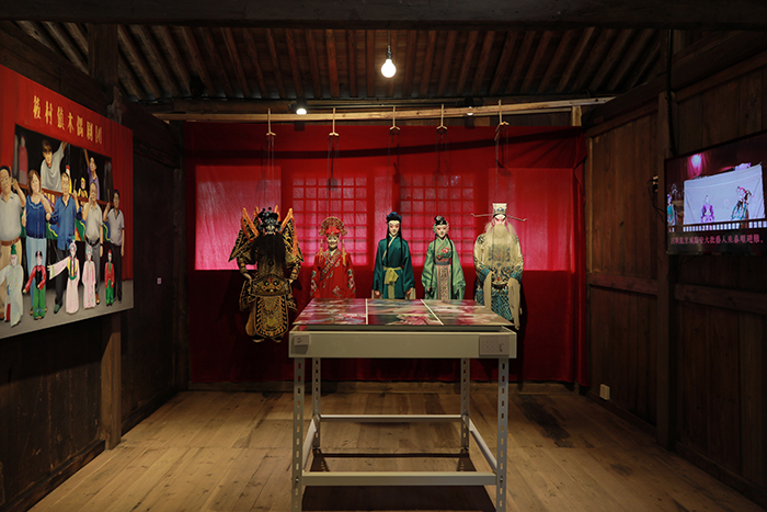 在二層的展廳中,展示了徐岙底村其他特色文化。提線木偶是一種古老的傳統木偶戲,古稱“懸絲傀儡”,流行于閩南方言區。木偶頭用樟木或紋質細膩的雜木雕刻而成的,木偶內設機關,通過絲線控制,使眼、鼻、口、舌活動,身體可作前后俯仰、左右擺動。表演時,藝人用線牽引木偶表演動作。衣袂飄飄、妝容精致的木偶,在十數根細線一提一放地細致操作下,從肢體到眉眼都活靈活現。一般的木偶戲,演員隱藏在幕后,但提線木偶,演員在臺上操縱,觀眾可以同時欣賞真人演員的唱腔和木偶的動作,表演生動傳神,難度極高。展區內集中展示了妝容精美的木偶原型、劇照和畫家王遠錚為筱村鎮木偶劇團繪制的油畫作品。