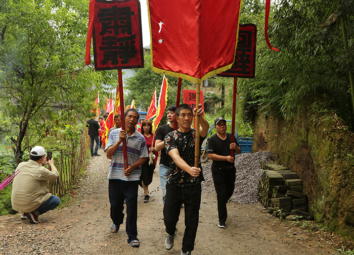 7月8日這一天正值陰歷六月六,此時的男女老少村民身著彩妝,舉旗、抬轎、放鞭炮,隊伍喧聲鼎沸、浩浩蕩蕩從徐岙底村穿行而過。
