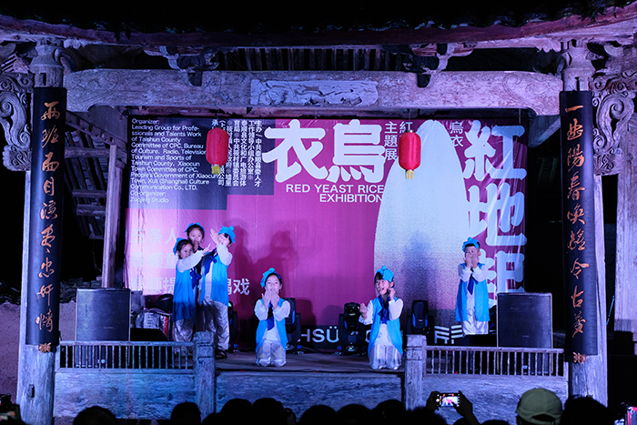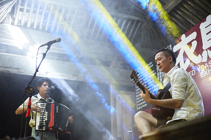 夜晚的文藝演出在徐岙底村吳氏祠堂上演,十里八鄉的村民和嘉賓們沿村中小路魚貫而來,小小的院落里擠滿了觀眾。首先出場的是童謠表演,幾位身穿淡藍色古裝的小演員用稚嫩的童聲演唱了童謠歌曲,緊接著非遺傳承人季天淵表演了提線木偶劇《貴妃醉酒》。來自廣東的民謠組合五條人樂隊成為本場的壓軸演出,五條人樂隊創作了大量方言歌曲,富于南方音樂旋律,伴隨著漸起的雨聲,他們演奏了多首樂曲,將晚會的氛圍推向高潮。