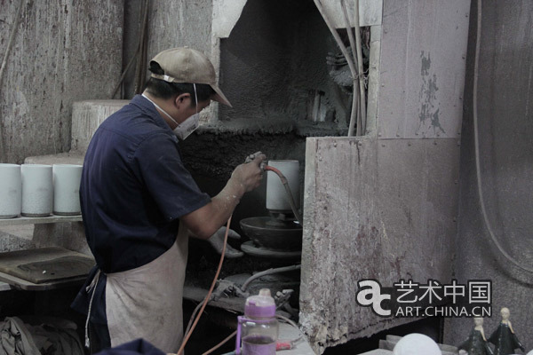 萬旗藝術中心工人為陶瓷藝術品進行噴釉作業