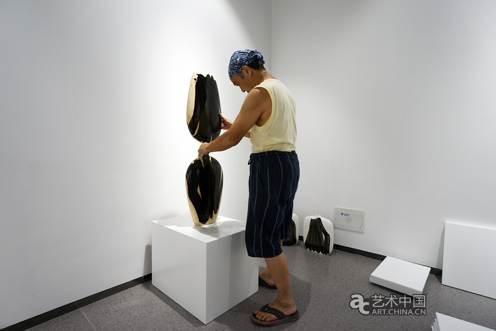 日本藝術家原田久在展廳擺放自己的作品