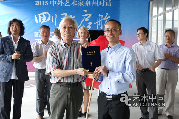 由福建省萬旗藝術中心董事長謝文清向各國藝術家頒發作品收藏證書,藝術家薛行彪代表領取
