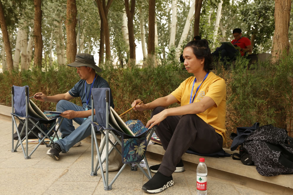 中國藝術家薛艷麗和王海強在莫高窟前寫生