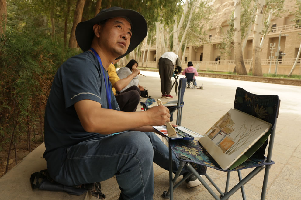 中國藝術家駱驍在莫高窟九層塔前寫生