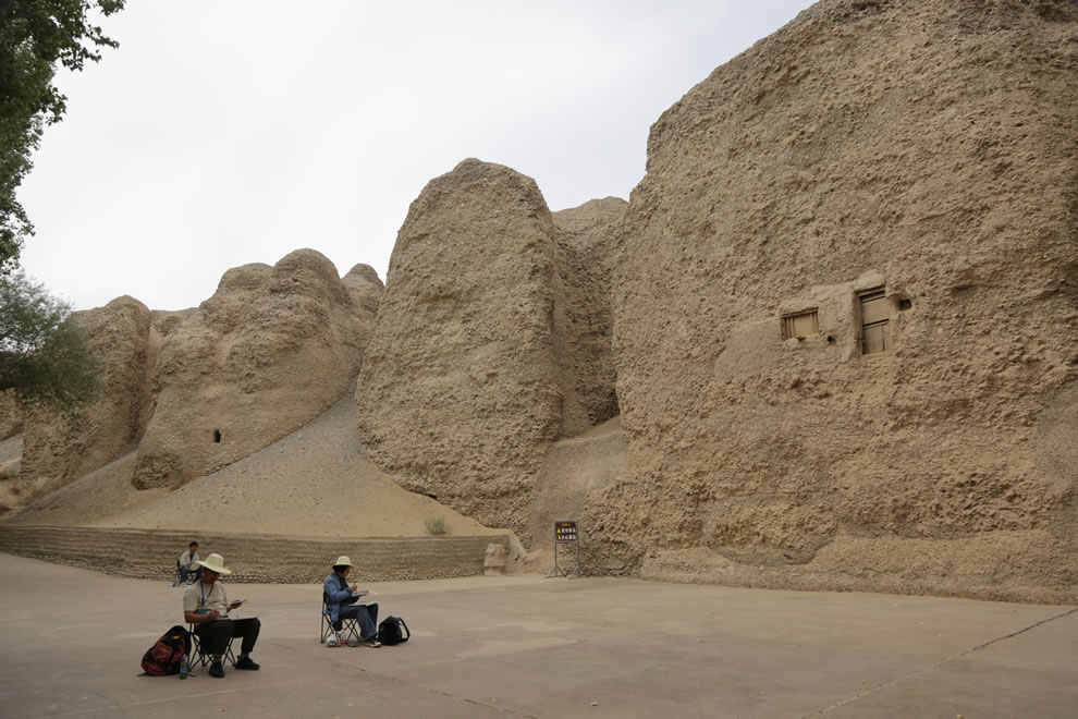 中國藝術家岳鋒和王玉芳在西千佛洞前寫生