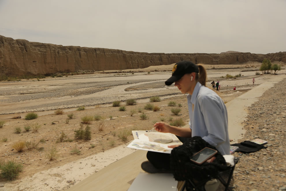 俄羅斯藝術家佩列佩利欽·安娜斯塔西婭在黨河岸邊寫生