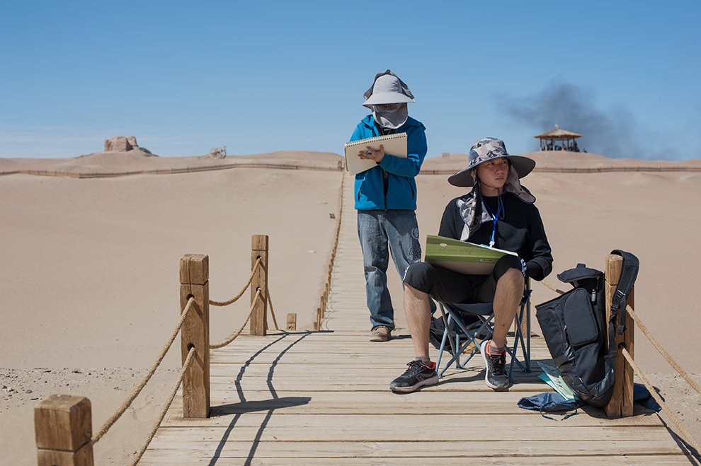 日本藝術家山仲 可文與韓國藝術家安鐘赫在陽關景區寫生創作 攝影:岳鋒