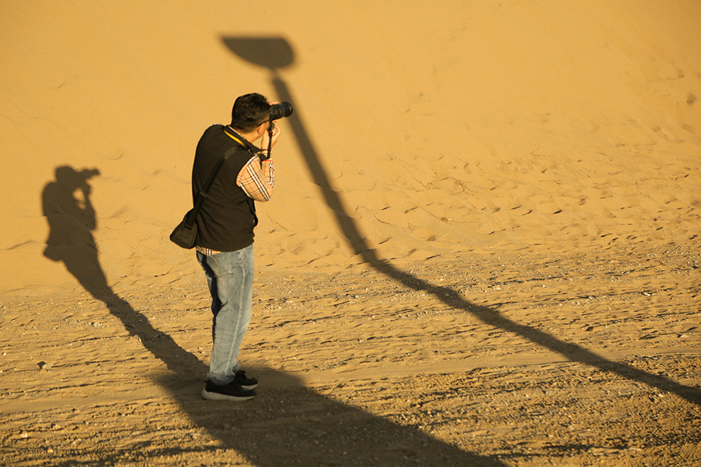 中國藝術家熊禮斌在鳴沙山月牙泉景區拍攝素材