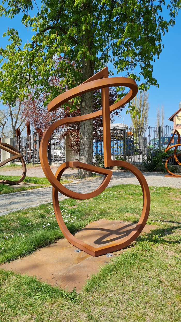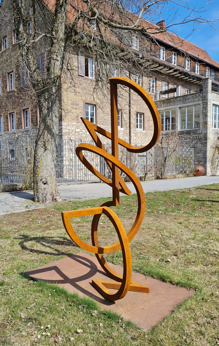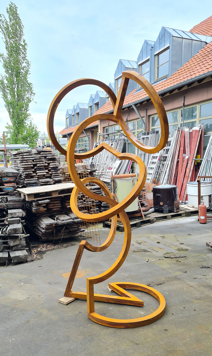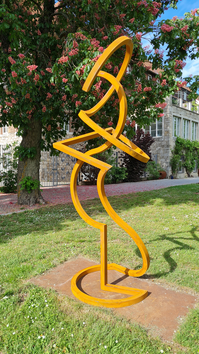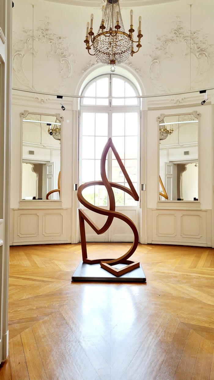 無論是大尺寸還是小尺寸,我們在今天再次體會到,三維藝術品帶給我們對空間的截然不同的體驗。在索尼婭·埃德爾·馮·赫斯勒的作品中,一條穿越空間的線條根據其方向和長度,使得空間中的一條路線、一條路徑清晰可見。 索尼婭·埃德爾·馮·赫斯勒的無盡循環不僅極具活力,在空間中構成了運動的線條,而且當我們觀看它們時,我們也不得不移動,因為作品的方向是靈活的,取決于位置,它們呈現出多種形式。 在我看來,這位藝術家將一段音樂的結構與不斷變化的雕塑理念相結合。有更安靜和更具活力的部分,重復的主題和變化。這些循環總是沿著平衡的邊緣摸索前進,這令人著迷。它們立于圓弧之上,可以移動,你會有一種作品幾乎在漂浮的感覺。同時,我們體會到了易碎、難以彎曲的鋼材與雕塑歡快、俏皮的輕盈之間的張力。 在展出的作品中,索尼婭·埃德爾·馮·赫斯勒表明藝術是一種感官體驗,而不僅僅是為了吸引思維。每一件作品都可以想象成巨大的尺寸,這樣理論上人們就可以進入雕塑并參與其變化。從這個意義上說,她的無盡循環與觀眾和空間相互作用。 盡管它們沒有描繪自然過程,但我們體會到了類似的運動和變化的理念。這體現在線條、曲線和交叉點的相互作用中。通過這種方式,這些鋼鐵雕塑蘊含著平靜與活力,它們向空間伸展,然后再次靜止,它們擴張,然后又再次收縮。 在 20 世紀 90 年代中期,這位藝術家從繪畫中發展出了無盡循環的主題,最終產生了將這些設計帶入三維空間的愿望。她的作品仍然基于繪畫和小模型,實際上可以將它們稱為空間繪畫,因為它們的線條勾勒出了空間的各個部分,界定了內部空間和外部空間。見解和瞥見出現了,而空白空間——類似于音樂中的停頓——與存在的材料具有相同的重要性。 這位藝術家只是用金屬蠟處理鋼材的表面,所以我們的注意力完全集中在形式上,我們用眼睛跟隨線條,感受它們回到自身的過程。無盡循環當然與“無限”和“無界”等概念相關,因此用金箔來強化這一理念是顯而易見的。她的金版作品仿佛從內部自身閃耀著光芒。 ………. 索尼婭·埃德爾·馮·赫斯勒將圓弧和直線從表面折疊到空間中,使得空間也呈現為一個被界定的中間空間,從而被鋼鐵的線條所標記。本次展覽的主題:運動! 安特耶·萊希萊特博士。