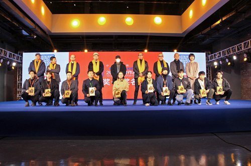 2021年度“曾竹韶雕塑藝術獎學金”作品展評委會主任、中央美術學院雕塑系主任張偉宣布曾竹韶獎獲獎名單,獲得2021年度“曾竹韶獎”的同學與嘉賓合影