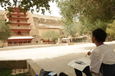 中國藝術家李敦在莫高窟前寫生