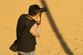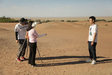 中國藝術家熊禮斌在鳴沙山月牙泉景區拍攝素材
