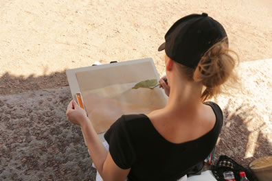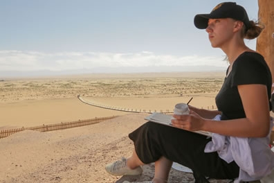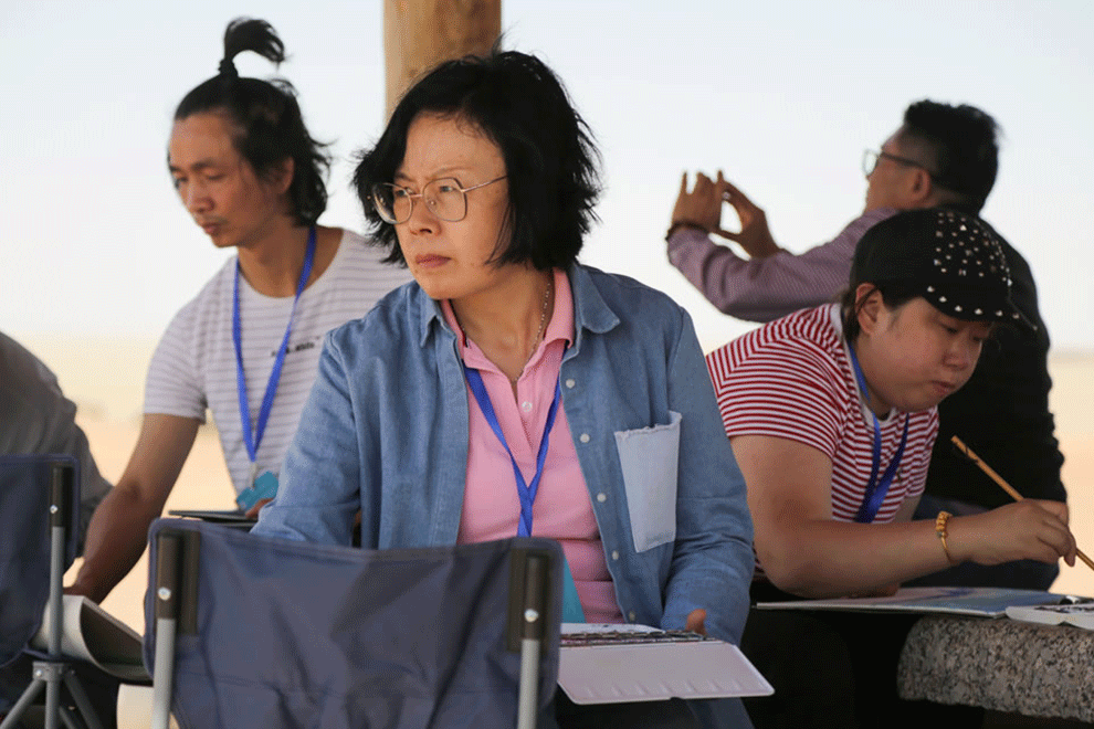 中國藝術家王玉芳在鳴沙山月牙泉景區寫生
