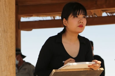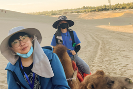 日本藝術家山仲 可文與韓國藝術家安鐘赫在鳴沙山月牙泉景區 攝影:倪納納