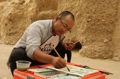 中國藝術家白建濤在西千佛洞前寫生