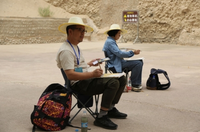 中國藝術家林金福與李敦在莫高窟前寫生