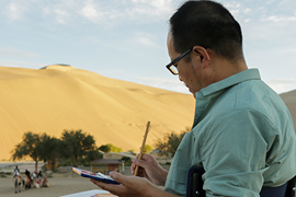 中國藝術家岳鋒在鳴沙山月牙泉景區寫生