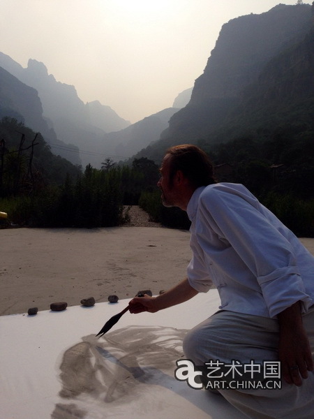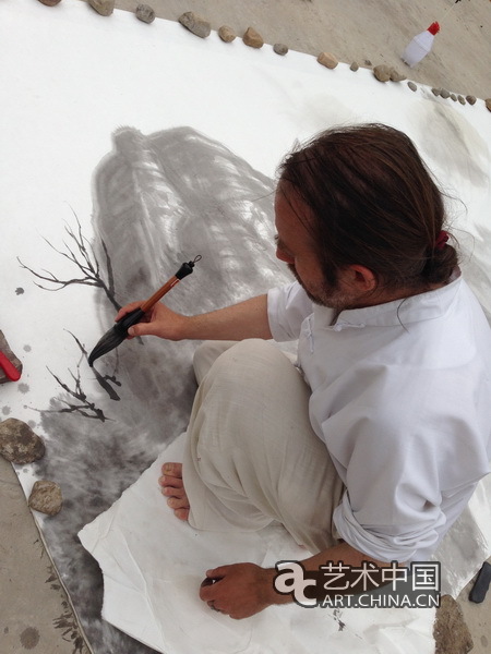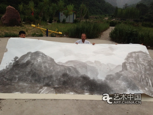 伊瑞選擇了太行大峽谷旁邊的一塊較為平整的空地,在地上擺開了2米×4米的毛氈,赤腳在宣紙上作畫,面對巨大的太行山,他將眼見之山搬到了這張巨大的宣紙上,從起筆到結束大概用了3個小時左右,最后一張完整的作品基本完成。正如他昨天所說,太行山不能用小尺幅來畫,必須用大尺幅才能繪制出它的沉雄和博大。如此壯觀的場面,不停的引來游人駐足觀看。