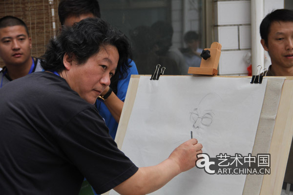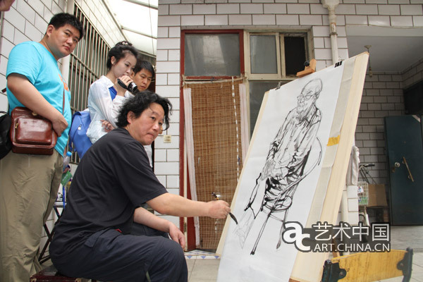 張院長首先用炭筆起稿,他仔細觀察寫生對象的特點與動作,隨著炭筆在手中的娑娑聲,沒幾分鐘,一張幾乎等人大小的速寫稿已經躍然于四尺整紙上。隨后用墨開始勾勒描繪眼前的形象,焦濕濃淡,恰到好處,每一筆都有其獨特的作用和韻味,最后隨類賦彩,一張神情栩栩的紅旗渠英雄像大致完成,整個過程過程不到兩個小時。