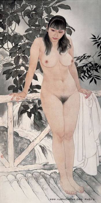 何:中國畫不可能像油畫那樣去直白地表現。照相機打好燈光就可以制造出古典油畫的效果,可是沒有任何一部相機可以制造出國畫的味道來,因為中國畫本身就不是絕對寫實。所謂寫實,也是一個借用,是在某方面大致寫實,但從整體上必須是寫意的,它的真實是本質上的真實,而不是表象上的真實。你想制造一個真實空間去畫中國畫是開玩笑,畫完以后格調肯定不高,中國畫的材料就導致了不許你這樣畫,包括筆墨的味道,顏色的淡雅都不允許你照著一個真實的素描關系去畫,必須要經過提煉。我的作品就是高度的概括,只是在某處該寫實的時候就實,不該實的時候絕對放棄。很難想象中國畫是能拿照片替代的,中國畫的生命力也在于此,中國畫將來的命運決不會像西畫那么悲慘。油畫肖像完全可以被照片替代,然而工筆肖像照片就替代不了,因為必須概括,必須和真實不一樣。創作同樣一個題材的作品,中國畫就有很多限制、很多不好解決的東西,不像油畫什么都能畫,什么樣的情境都能畫。燈光產生的韻味、產生的明暗、明暗所產生的力度、制造的空間等等在創作時把色彩表達充分就可以了。我們談意境的時候往往想到山水,其實人本身就有意境,這個意境從何而來?從他的造型上、從他的神態上、從畫面的形式上。我們應該要求作品中的造型成為一種有意味的、有境界的造型。中國人物畫就應該向雕塑學習,雕塑沒背景但能表達出人的意境,中國畫空白特別多,很多東西只能空白,因此必須要求造型本身就有意境。我課堂上畫的寫生是超出了以往美術學院課堂教學的寫生作業的,完全可以當作獨立的作品來對待。我的寫生還不是給我自己擺的,是給學生擺的,我要求學生每個角度都有完美的造型,然后我再挑一個學生不選用的地方去畫畫。畫完了,我也沒時間搞背景,空白特別多,但是仍然有意境。像《孤葉》,在畫素描稿的時候就非常感人,略帶病態的人物似有思想,人物想問題進入物我兩忘狀態,完全放松沒有自我的時候,才眼睛發呆。不是我畫得傻、畫得呆,而是抓住人物這樣的一種感覺,反而有意境了。人物沒有笑容,沒有悲哀,反而深刻。我早就醞釀著要畫這樣一個東西,冥冥之中有一個東西在牽引著我,總惦記著它。我最開始是想畫一個有個性的農村女孩子,跟文革以后的那種大腦殼、雙眼皮、小鼻子、小嘴、小下巴的"甜妹"造型相反,作品很大氣、很舒展、很渾厚、很古樸。