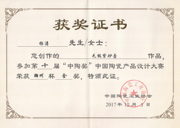 2017年12月,“無極紫砂壺”獲“第十屆中國陶瓷產品設計大賽”金獎。